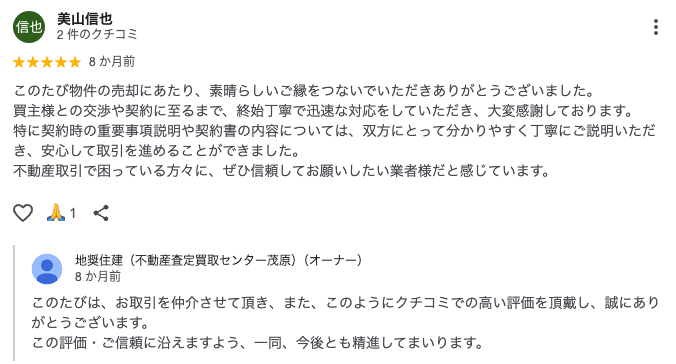 特に契約時の重要事項説明や契約書の内容については、双方にとって分かりやすく丁寧にご説明いただき、安心して取引を進めることができました。不動産取引で困っている方々に、ぜひ信頼してお願いをしたい業者様だと感じています。