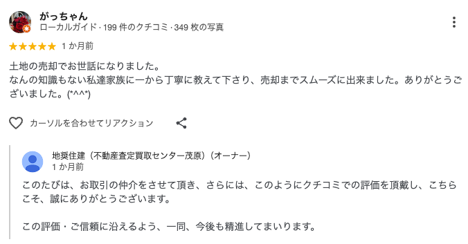 - 土地の売却でお世話になりました。なんの知識もない私達家族に一から丁寧に教えて下さり、売却までスムーズに出来ました。ありがとうございました。(*^^*)